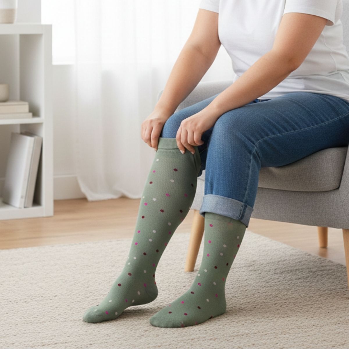 KNELANGE STØTTESTRØMPER I BAMBUS, GRØNN MED PRIKKER